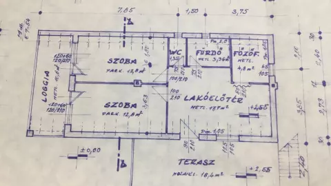 Földszint nettó alapterülete: 63,6 m2: 2 szoba (12,8m2, 12,8m2), lakóelőtér 17,7m2, konyha 4,8m2, zuhanyzó 3,36m2, wc 1,35m2, loggia 10.8m2